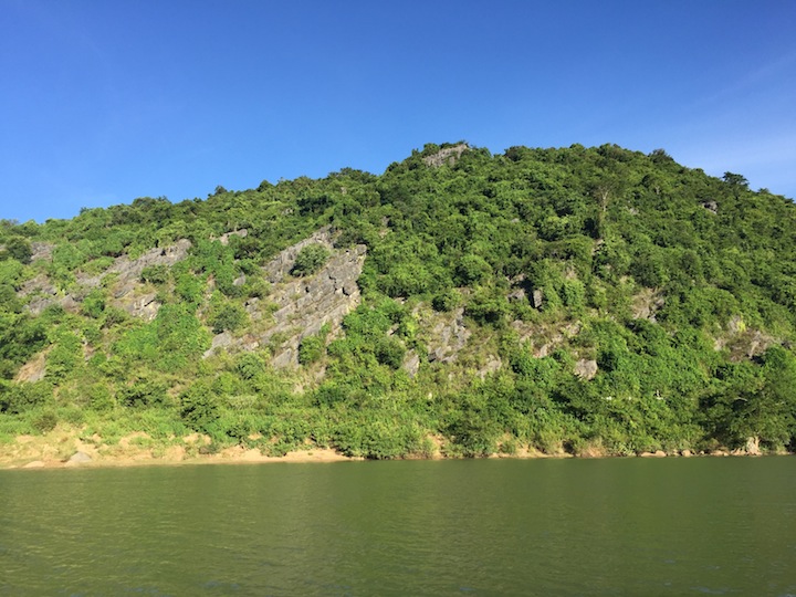 Du khách xuống thuyền máy đi theo sông Son vào động Phong Nha. Sông Son rộng chừng 35-40m, nước xanh ngắt, trong thấu đáy, nhìn rõ cả những đàn cá đang bơi và mất khoảng 30 phút thì tới động.